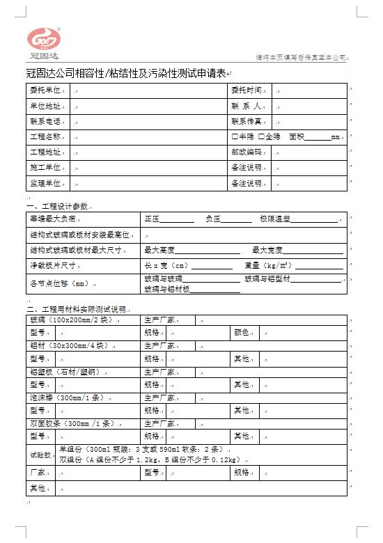 如客戶確定采用本公司系列產品時,請協(xié)助我們做好以下幾項工作:以最快的方式將工程所選用的基材(玻璃/鋁材或復合板)、輔助材料(雙面膠條和泡沫棒)、節(jié)點設計圖紙和相容性申請 表格寄送到我公司客服部或質檢部,我們將按有關標準要求進行粘結性、相容性試驗。
